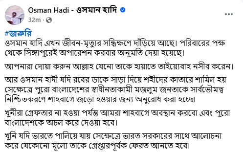পোস্টে বলা হয়েছে, ওসমান হাদি বর্তমানে জীবন–মৃত্যুর সন্ধিক্ষণে রয়েছেন। পরিবারের পক্ষ থেকে তাকে সিঙ্গাপুরে উন্নত চিকিৎসার জন্য অপারেশনের অনুমতি দেওয়া হয়েছে। এই সংকটময় সময়ে সবাইকে অনুরোধ করছি, আল্লাহর দরবারে তার দ্রুত আরোগ্য ও হায়াতে তাইয়্যেবাহর জন্য দোয়া করার জন্য।